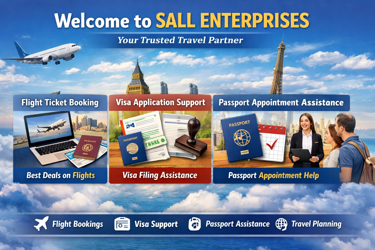 SALL ENTERPRISES is a trusted travel service provider dedicated to making your travel planning simple, convenient, and reliable. Whether you are traveling for business, tourism, education, or family visits, our experienced team offers professional guidance and complete support throughout your travel process.